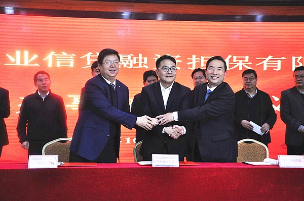 省农担公司副总经理常礼军、市财政局局长王满院、市城投集团党委书记、董事长、总经理李立战签订合作协议