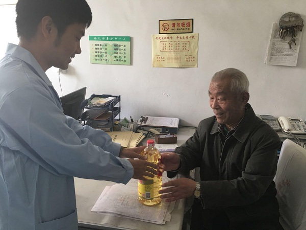 志愿者为老人送上慰问品