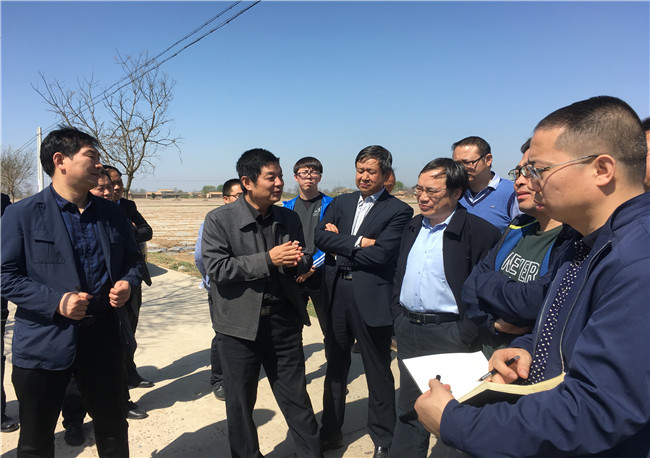 谢小明(左二)向高聚忠(右三)介绍职田镇青村工业园区相关情况