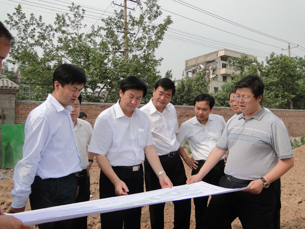 附图为公司董事长、总经理李忠平(左)同公司副总经理李立战(右)向市长庄长兴(中)及市上领导汇报统一广场以东土地垃圾清运及绿化工程进展情况。